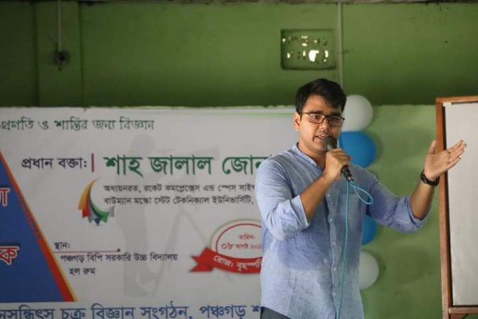এবার আমাদের “আজকের বিজ্ঞান বিষয়ক” সেমিনারে প্রধান বক্তা পঞ্চগড়ের কৃতি সন্তান প্রথম বাংলাদেশি হিসেবে রাশিয়ার বাউম্যান মস্কো স্টেট টেকনিক্যাল ইউনিভার্সিটিতে রকেট কমপ্লেক্সেস এন্ড স্পেস সাইন্স বিভাগে অধ্যয়নরত পঞ্চগড়ের শাহ জালাল জোনাক। সম্প্রতি ছুটিতে বাড়ি ফিরেছে সে। পঞ্চগড় বিপি সরকারি উচ্চ বিদ্যালয়ের হলরুমে বিজ্ঞান বক্তৃতা ও সচেতনামূলক প্রচার শিরোনামে অনুসন্ধিৎসু চক্র বিজ্ঞান নামে এক সংগঠনের অনুষ্ঠানে জোনাক তার রকেট কমপ্লেক্সেস এন্ড স্পেস সাইন্স বিষয়ে তার অভিজ্ঞতা ব্যক্ত করেন।